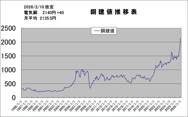 銅建値トン4万円上げの214万円に改定。